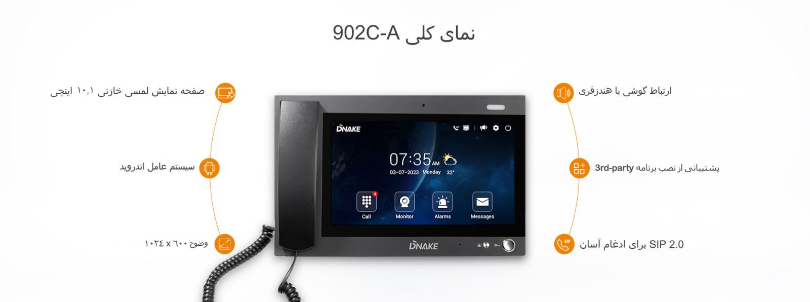 تلفن تصویری DNAKE مدل 902C-A، یک ایستگاه مرکزی (IP Master Station) پیشرفته مبتنی بر سیستم عامل اندروید است که برای مدیریت و نظارت بر سیستم‌های ارتباطی و امنیتی طراحی شده است. این دستگاه با صفحه نمایش لمسی رنگی و رابط کاربری مدرن، تجربه‌ای ساده و کاربرپسند از کنترل و ارتباط با سایر دستگاه‌های امنیتی و شبکه‌های داخلی ارائه می‌دهد. طراحی شیک و کاربرپسند این تلفن، آن را به گزینه‌ای مناسب برای محیط‌های مسکونی و تجاری تبدیل کرده است.